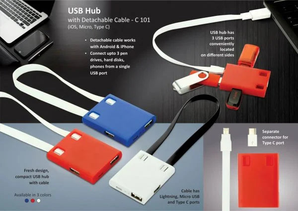 C101 – USB Hub with detachable cable (iOS, Micro, Type C) | 3 USB ports