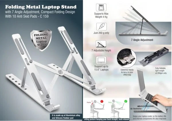 C159 – Folding Metal Laptop stand with 7 angle adjustment | Compact Folding design | With 10 anti skid pads