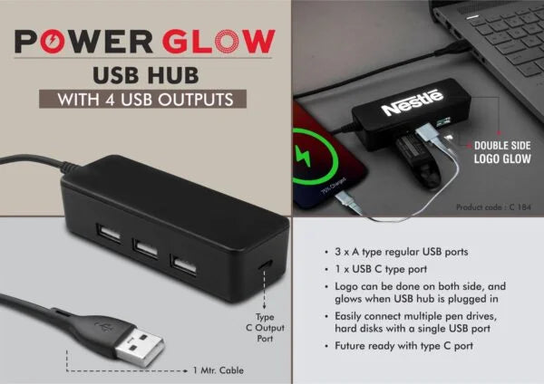 C184 – PowerGlow USB hub with 4 USB outputs | Double side Logo Glow | Type C output port | 1 mtr cable