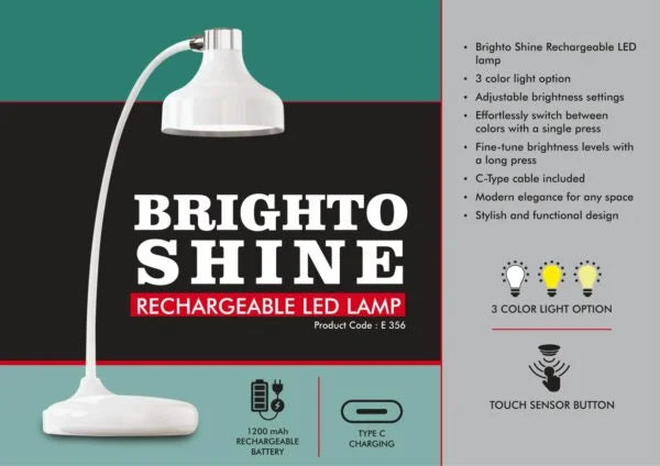 E356 – Brighto Shine : Rechargeable LED lamp | 3 Color light with Brightness adjustment | Type C Charging