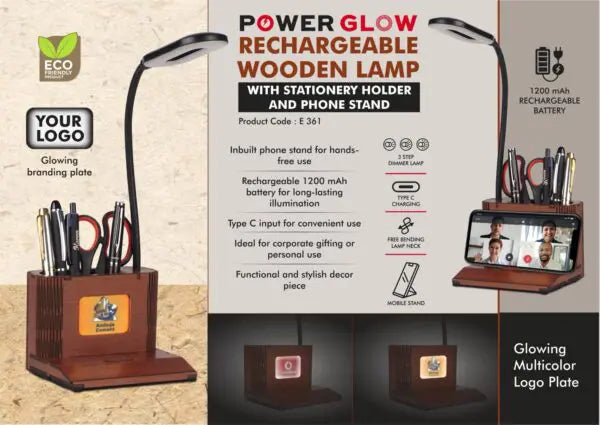 E361 – PowerGlow Wooden 3 step Dimmer Lamp With Glowing Multicolor Logo plate & Phone stand | Rechargeable 1200 mAh battery | Type C input | Branding MOQ 200 pc