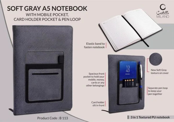 B113 – Soft Gray A5 notebook with mobile pocket, card holder pocket & pen loop by Castillo Milano
